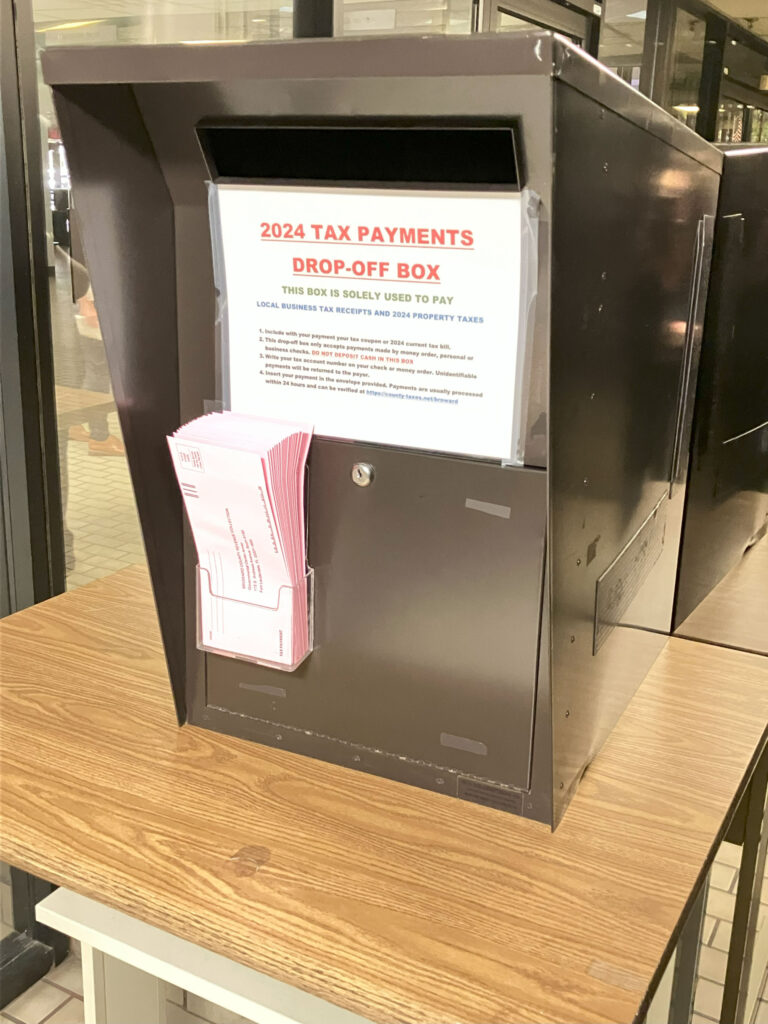 - Bring your payment to one of our secure drop-box locations. Secure drop-boxes are checked twice daily and are located next to the security posts on Brickell Avenue at the Broward Governmental Center.